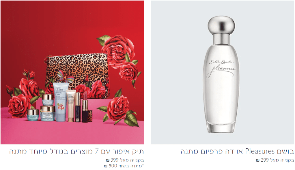 קרם לחות מתנה בכל קניה באתר של אסתי לאודר! בושם מתנה בכל קניה ב – 299 ש"ח ומעלה, תיק עם 7 מוצרים בגודל מיוחד מתנה בכל קניה ב – 399 ש"ח, שווי המתנה 500 ש"ח!
