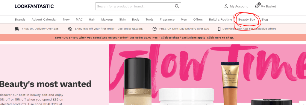 5. כדי להנות מ15 פאונד הנחה על הלוח שנה, עברי כעת להוספת הביוטי בוקס לסל הקניות. שימי לב שההנחה עובדת רק עם מנוי של 3 חודשים ומעלה. לחצי כאן למעבר לביוטי בוקס >> או לחצי על העמוד של ביוטי בוקס בשורה למעלה: