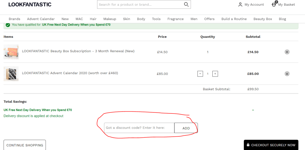 9. הגענו לסל הקניות וכעת הסכום עומד על 100 פאונד. מוסיפים את הקוד הנחה במקום שסימנתי בעיגול אדום סימטרי וישר, ולוחצים על ADD: