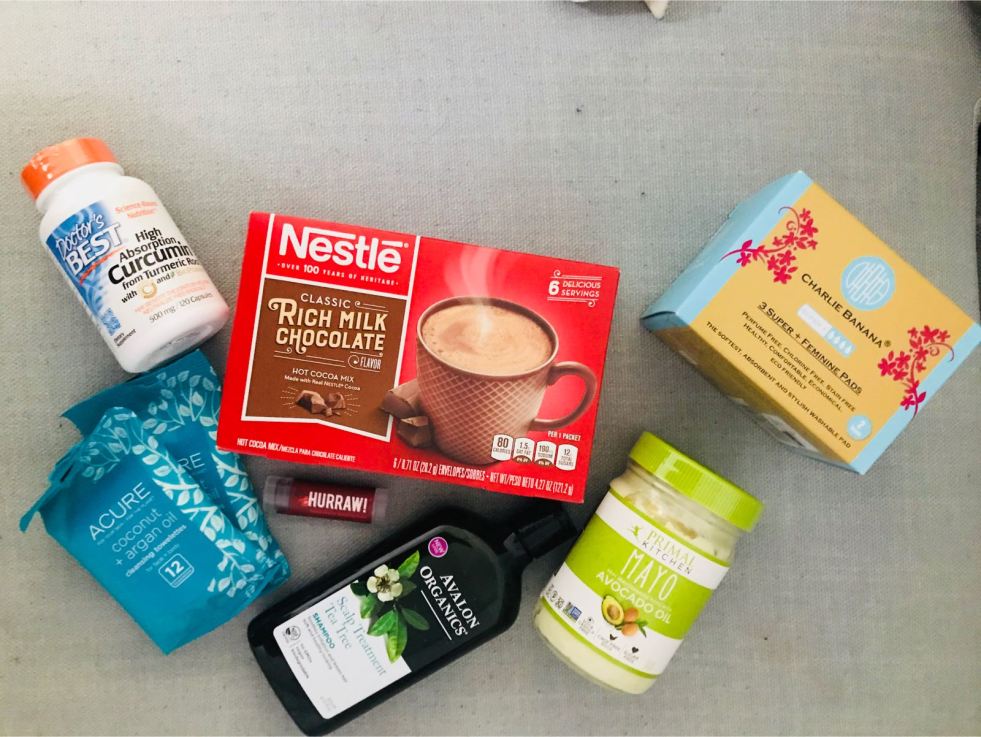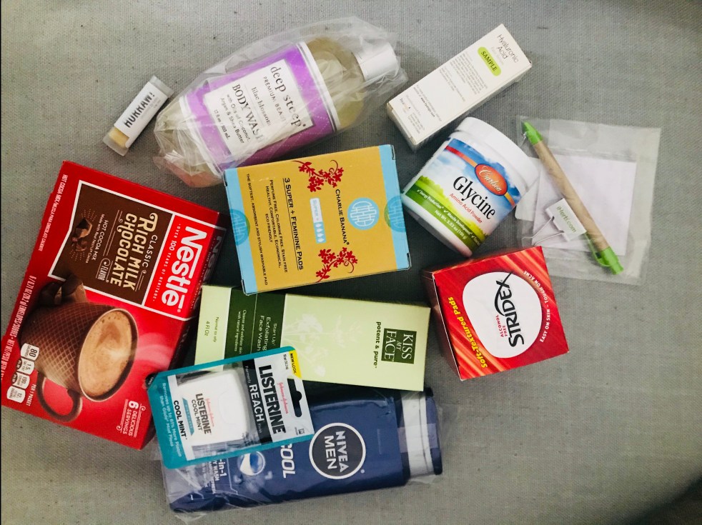 סרום חומצה היאלורונית, שוקו של נסטלה, חוט דנטלי של ליסטרין, סבון גוף, שפתון באלם לשפתיים יבשות, פדים לפנים, סבון פנים עם גרגירים, שמפו 3 ב-1 של ניבאה, תחבושות בד רב פעמיות של צ'ארלי בננה, פתקיות + עט של איי הרב ואבקת גליצין